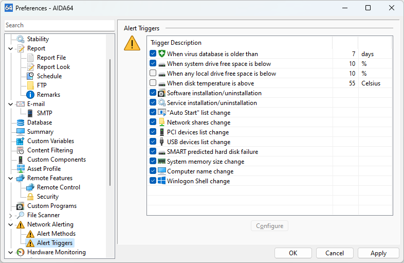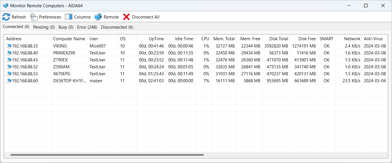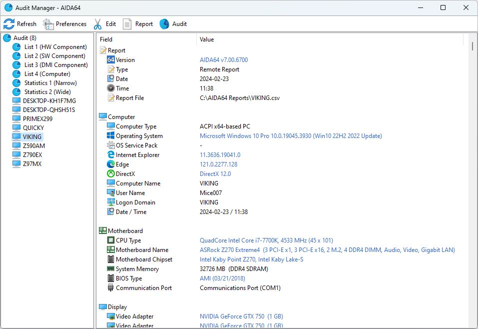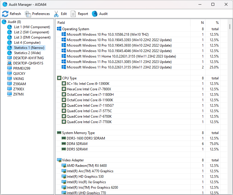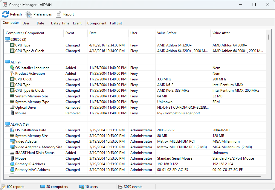 AIDA64 Business 能夠從企業網路中的 Windows 客戶端收集極為詳盡的硬體與軟體清單。憑藉命令列開關支援,清點流程可完全自動化;PC 收集到的報告可儲存為開放格式以便後續處理,也可存入 SQL 資料庫。整合的變更管理器能對不同時間點採集的網路審計快照進行比對與追蹤。當出現異常事件時,它可實時通知管理員,並支援遠端監控與遠端控制,助力 IT 運維與故障排查。相容所有 64 位 Windows 版本,包括 Windows 11 與 Windows Server 2022。